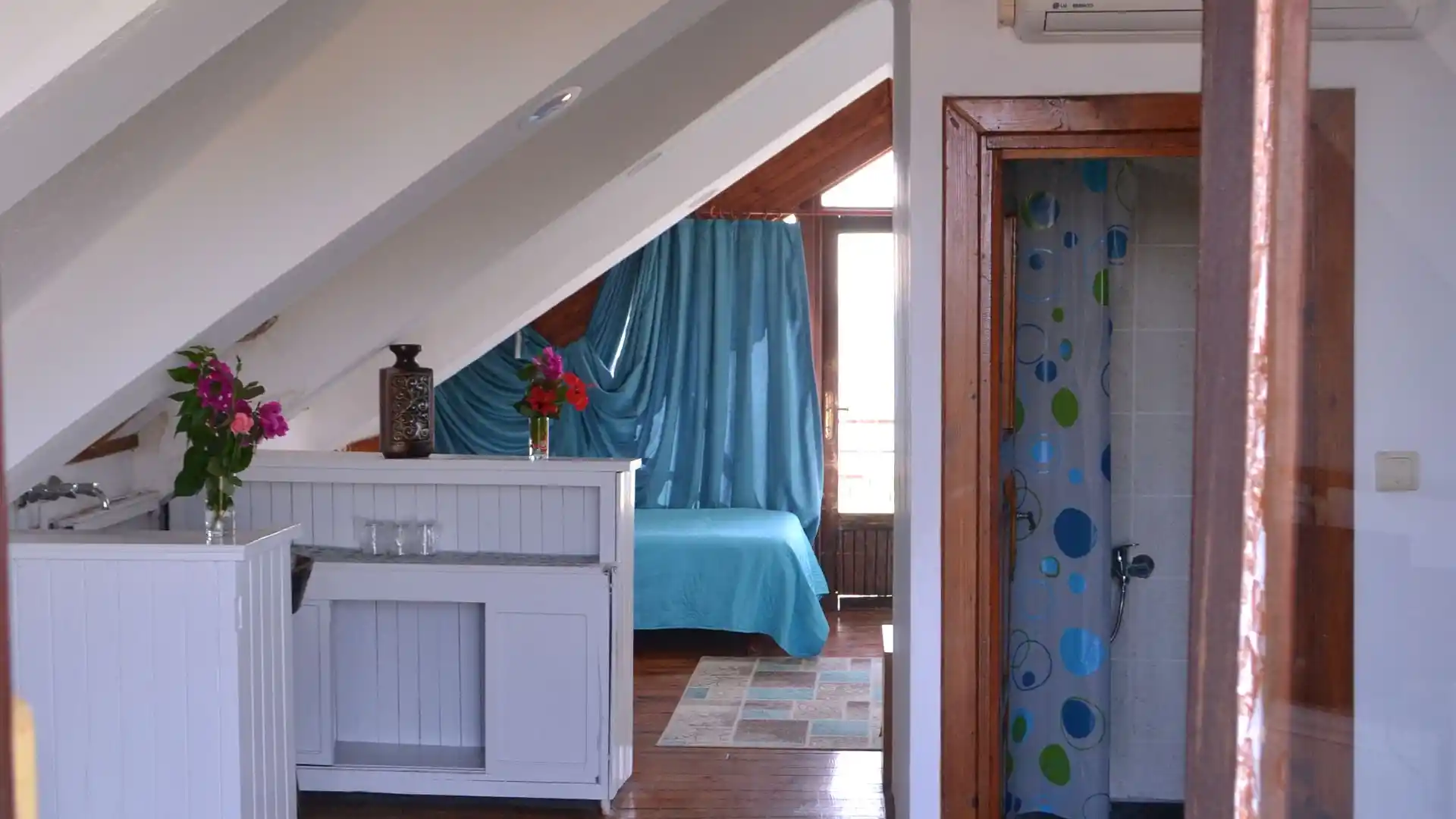 on dakikada gezilebilir. Otelimiz taş ve ahşabın çatıyla birleştiği, asmalarla